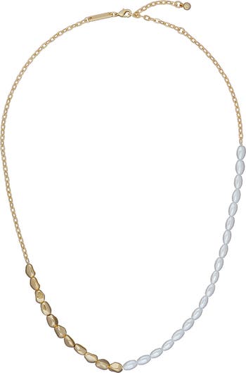 Goldtone beads and imitation pearls gleam on a refined chain necklace that instantly elevates any look.