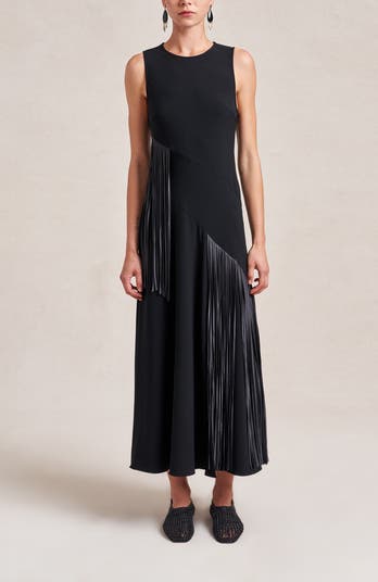 A quiet black dress with a lot of attitude, this midi with spiral seams and placed satin fringe gives tons of movement while flattering every angle.