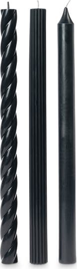 Add soft light and a sculptural accent to your space with a trio of unscented taper candles in smooth, ribbed and twisted textures.