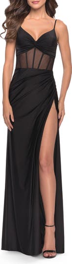 Jersey dress with illusion bodice and boning. High skirt slit and twist front bodice. Back zipper closure.