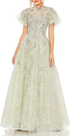 Romantic lace ball gown featuring an illusion high neckline, flutter sleeves, intricate beadwork, and a flowing full skirt, perfect for formal events, galas, and weddings