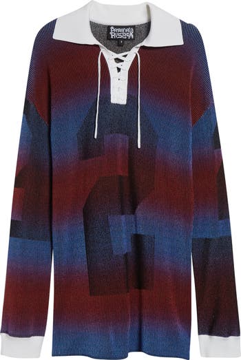 Russo expands her collection of innovative knitwear with this oversized polo made with her signature 'illusion' technique, where careful stitch placement and yarn color shifts create eye-tricking patterns that seem to subtly morph as the wearer moves.