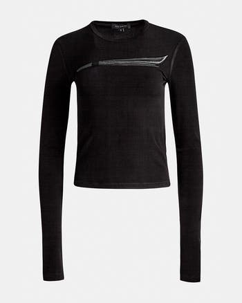 A fitted black long-sleeve top in stretch jersey, featuring a graphic accent across the chest that references Kate Barton’s sculptural seam lines.