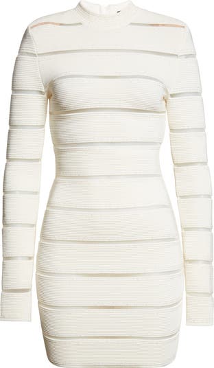 Olivier Rousteing reinvents the '90s-fave bondage minidress in this long-sleeve version featuring illusion stripes and ribbed panels embroidered with tiny sprinkles of shimmer.