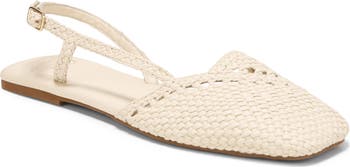 Woven composition enhances the everyday refinement of a square-toe flat complete with a slingback strap.