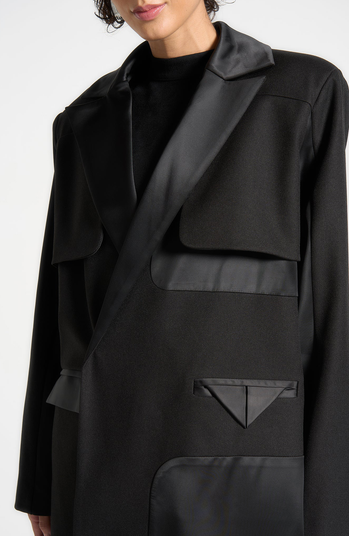 This trench coat silhouette reimagines a timeless outerwear staple with modern refinement. Contrast fabric detailing introduces texture and depth, while a detachable belt allows for versatile styling and waist definition. Finished with classic lapels, it delivers a clean, tailored edge that balances elegance with practicality.
