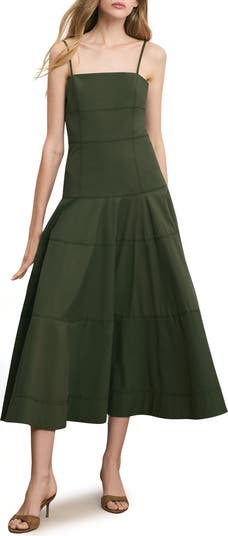 Tonal topstitching adds a soft style point to an endlessly wearable cotton-forward dress hung from adjustable straps to customize the fit.