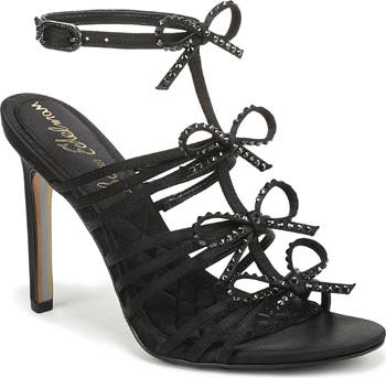Jewel-encrusted bows saunter down the caged vamp of a glam sandal lofted by a soaring stilleto heel and secured with an adjustable buckle closure.