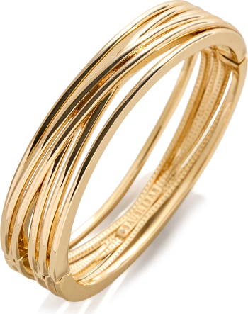 Interwoven goldtone bangles create a layered silhouette that brings modern polish and dimensional shine to the wrist.