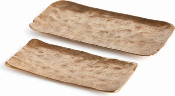 Modern, rectangle forms and rounded edges make this pair of cast aluminum trays unique. Line with a collection of candles, or accessorize with whatever fits your style for a contemporary touch.