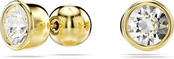 Round-cut Swarovski crystals glow in puffy settings on these simple and brilliant stud earrings.