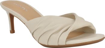Twisted and gathered leather tops a sleek sandal lofted by a slender kitten heel.