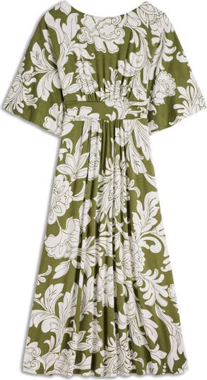 Ornate florals trail across this soft jersey dress shaped by kimono sleeves and a ruched waistband that flows into midi-length skirt.