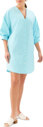 A row of imitation pearls secures this easygoing lantern-sleeve shirtdress made from breathable cotton.