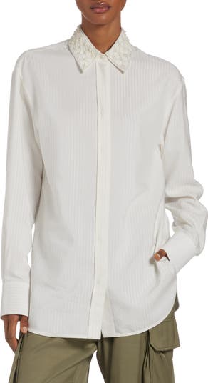 Inspired by everyday glamour in the City of Lights, pearlescent beads wrap the collar of this fluid button-up shirt textured with jacquard-woven stripes.