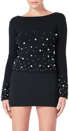 Luminous imitation pearls fall like stars on a night sky on this lovely sweater that's a glam way to layer up for the cooler seasons.
