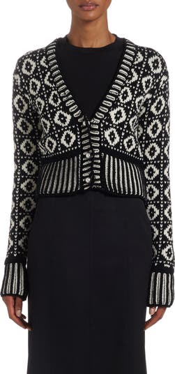 Inspired by everyday glamour in the City of Lights, pearlescent buttons decorate this cropped wool cardigan featuring a jacquard-knit geometric pattern.