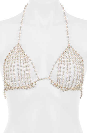 Imitation pearls are strung on golden chains on this daringly sheer halter bralette that's meant to be seen.