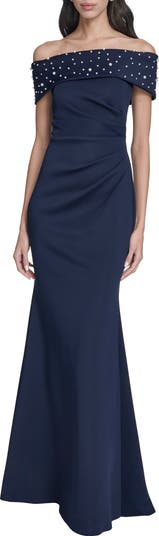 Get your pearls with this graceful gown set slightly off the shoulder and shaped with a bit of delicate ruching at the side.