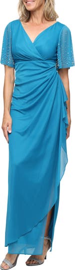 Lustrous imitation pearls and rhinestones fleck the sheer sleeves of this elegant gown that gracefully gathers at the side.