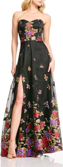 Shimmering threads send soft sparkle throughout the glittering garden that graces this glamorous strapless gown fixed with a full skirt featuring a leggy slit.