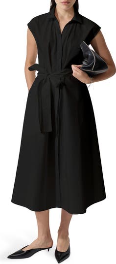 Cut from crisp poplin, this sophisticated yet summery shirtdress is updated in a sleeveless silhouette and centered with a defining tie belt.