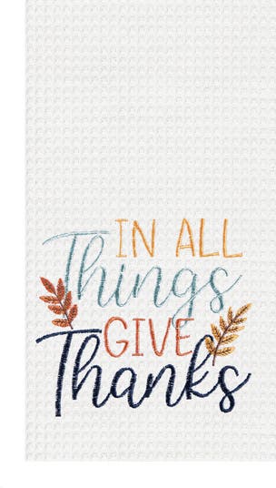 - Beautifully embroidered with the phrase “In All Things Give Thanks,” this 100% cotton flour sack towel brings a warm harvest touch to your kitchen. Its detailed wheat design adds texture and charm, perfect for autumn and Thanksgiving gatherings.