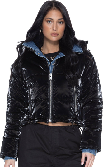 The perfect puffer for this winter is our In the Mix Denim Puffer that features two closures for twice the styling. You can zip the nylon puffer up to hide the denim interior or use the buttons along the denim for a more exciting look. The Hoodie can also be removed by easily zipping it off.