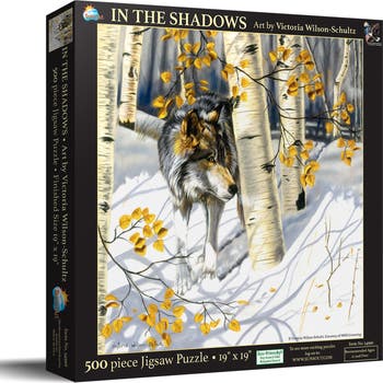 Immerse yourself in Victoria Wilson-Schultz's enchanting world through the "In the Shadows" 500-piece jigsaw puzzle, produced by SunsOut Puzzles. As you assemble the captivating artwork featuring a majestic wolf amidst golden fall leaves, indulge in nature's serene embrace that offers a both stimulating and calming activity. Crafted proudly in the USA, each piece is constructed from high-quality recycled cardboard, ensuring durability and ease of handling. SunsOut shows its commitment to quality and the environment, with interlocking pieces that fit flawlessly for an enhanced puzzle journey and a stress-free guarantee for any missing or damaged pieces. Each puzzle upholds SunsOut's dedication to eco-friendly practices, utilizing soy-based inks and recycled board constructed specifically for jigsaw puzzles. Breathe life into this enchanting image, reflecting the breathtaking beauty of wildlife, as depicted by Victoria Wilson-Schultz's licensed artwork. The completed 19" x 19" puzzle serves as a delightful challenge to engage the minds of both seasoned puzzlers and newcomers. Each purchase supports SunsOut, a woman-owned small business that upholds community values, offering an engaging product that stands for quality craftsmanship and support for local artisans. By choosing "In the Shadows", you not only dive into a creative world but also contribute to the thriving puzzle community.