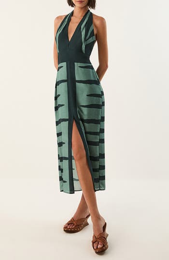 A bold, carefully placed print brings graphic appeal to this cover-up sundress fashioned with a sleek halter neck and leg-baring front slit.