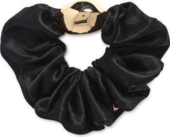 An oversized scrunchie complements elaborate updos while the golden pendant adds rich, elegant shine to your tresses.