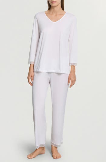 Drift off to dreamland in the comfort of these soft, flowy pajamas cut from mercerized-cotton interlock and framed by scalloped tulle trim.