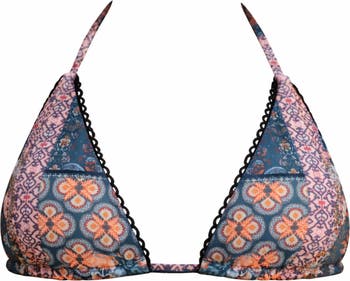 The India top features a moody mosaic print with navy, black, and warm burnt orange tones. Its multi-way triangle design is finished with a subtle scalloped black lace trim and removable padding for an easy, adjustable fit.