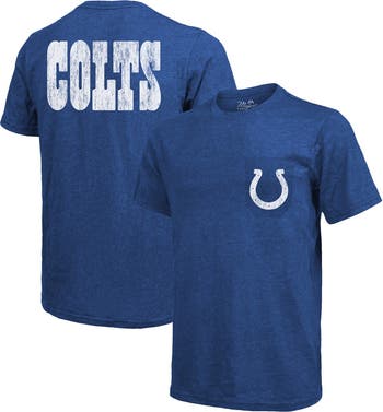 The Indianapolis Colts Majestic Threads Tri-Blend Pocket T-Shirt is the perfect way to show your unwavering support for the Indianapolis Colts. Crafted from a soft and durable blend of polyester, cotton, and rayon, this heathered royal tee features distressed screen print graphics that proudly display your team pride. The front chest pocket adds a touch of functionality, while the rib-knit collar and back neck taping ensure a comfortable fit. Whether you're cheering from the stands or simply showing your Colts spirit, this tri-blend pocket t-shirt is a must-have for any dedicated fan.