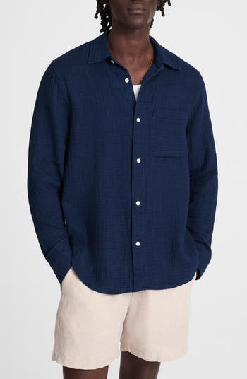 Dyed using real indigo, this all-cotton button-up features a classic camp collar, an airy, open weave and fish-eye buttons.