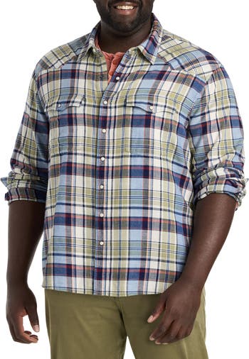 Whether you're a fan of the wild west, want to be a cowboy or just love the soft feel and relaxed comfort of 100% cotton, this Lucky Brand plaid shirt helps to evoke all the western vibes. Made from indigo-dyed cotton, the plaid, long-sleeve style features traditional tailoring like a spread collar, button-down front and double snap-button pockets and cuffs. Crafted in soft, 100% cotton and designed with an ideal fit for Big + Tall guys, it's easy to wear and allows for the freedom to move without restriction. Try it buttoned-up with jeans or layered over your favorite graphic tee.