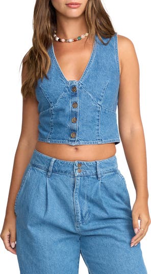 Effortless cool meets vintage-inspired vibes in this cropped denim vest, with a fitted cut and button-front detail that’s perfect for layering or making a solo statement.