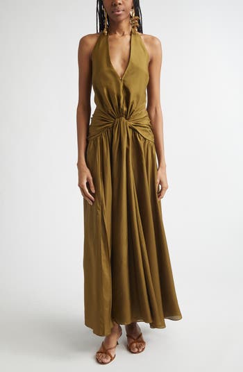 Bring the '70s-inspired island glam of the label's summer swim '26 collection to your sunny-day looks with this playfully seductive silk maxi dress with a plunging halter neckline and an open back that leads to exposed sides. The flowy look is designed to capture a 'spirit of escape' by blending the brand's signature romanticism with a relaxed, free-spirited edge inspired by Ibiza.
