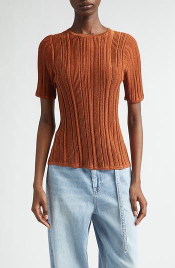 The metallic threads woven throughout the dimensional ribbing evoke a sun-soaked escape in this short-sleeve sweater styled like your favorite fitted T-shirt.