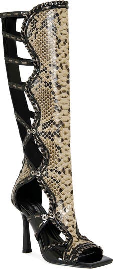 Blending gladiator style with high-fashion attitude, this striking open-toe boot features snakeskin-embossed faux leather panels framed by cut-out sides, leading to a flared stiletto heel that elevates and elongates.