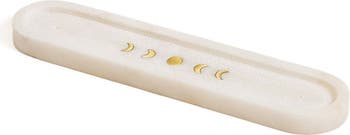 This elegant, hand carved white marble incense holder features a boho moon phase design in brass and two holes on each end for incense sticks. Add this incense burner to a home altar or to create a sacred space in the home. Create a peaceful sanctuary in the home or in an outdoor space. This would make a versatile gift for someone who likes to burn incense and appreciates the symbolism of the moon and its various phases.