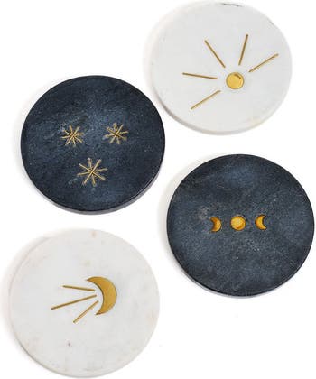 Adding to our Indukala moon phase collection this set of 4 coasters is a timeless and functional gift for many occasions including housewarmings and holiday gifts for him or her. This sleek black and white set with subtle brass inlay would fit in with a modern or boho aesthetic. This moon phase set of 4 coasters would make a lovely addition to a coffee table or dining table to impress dinner guests.
