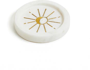 This simple round marble incense holder with a radiating moon design inlaid in brass is versatile enough to fit in with various design preferences whether it be boho, maximalism or modern minimalism.