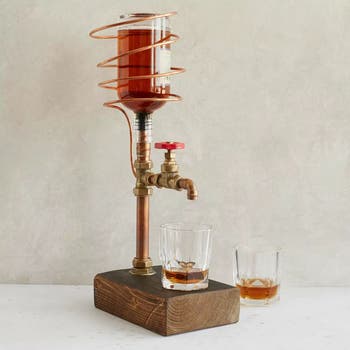 Your at-home bar deserves a little edge. Made by hand, this industrial drink dispenser sports a handsome length of copper tubing that hugs any bottle—and aerates its contents, too. The unique attachment allows bottles of all types to connect seamlessly to the brass spout, and it's mounted on a reclaimed wood board with a liquid-resistant Danish oil finish.