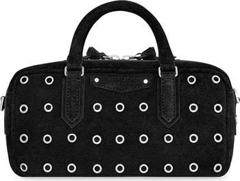 Allover grommet detailing brings chic edge to this compact leather bowler bag designed with a removable, adjustable crossbody strap.