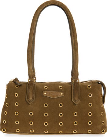 Gilded rivets add edge to a staple shoulder bag made from rugged suede.