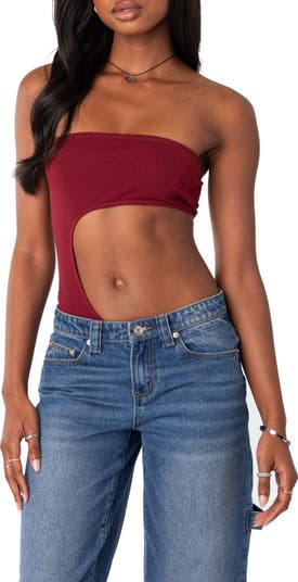 An edgy, asymmetric cutout shows plenty of skin in this modern bodysuit cut in a shoulder-baring strapless silhouette.