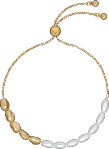 Imitation pearls and organic-inspired beads line this adjustable bracelet.