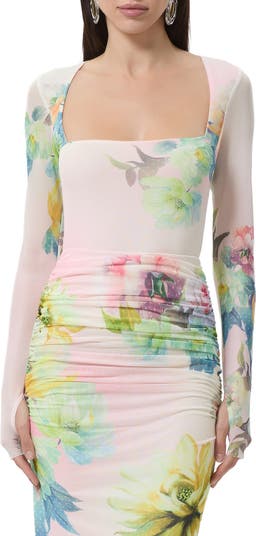 A hypnotic floral print adorns this long-sleeve top cut from airy mesh. The square neckline frames the silhouette, while the clingy, body-skimming fit highlights your curves.