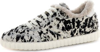 A spotted genuine-calf-hair upper and plush faux-shearling lining create a striking interplay of texture on this statement-making sneaker encircled by a ridged bumper sole.
